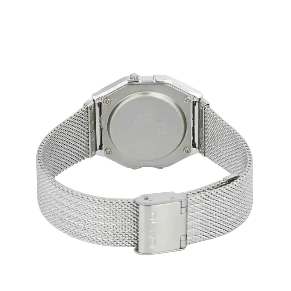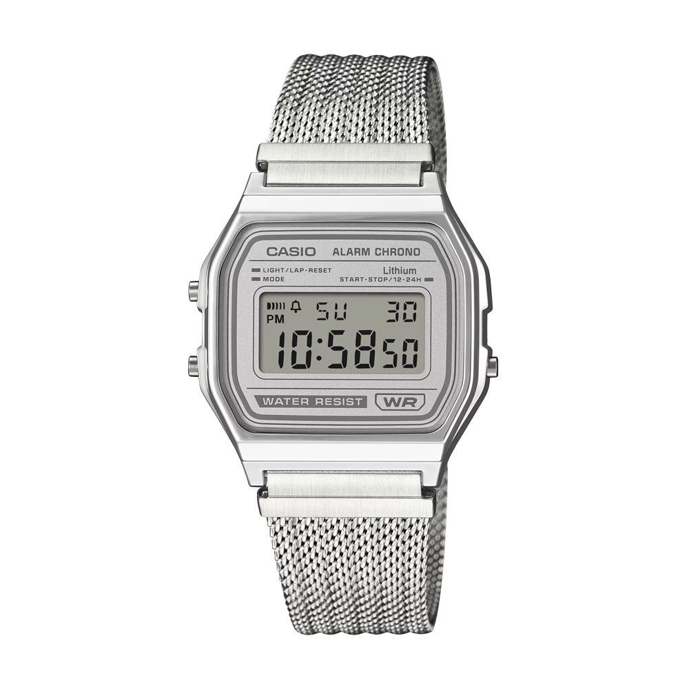 Casio Vintage A158WEM-7DF โ Silver Mesh Digital Watch with Light Grey Dial